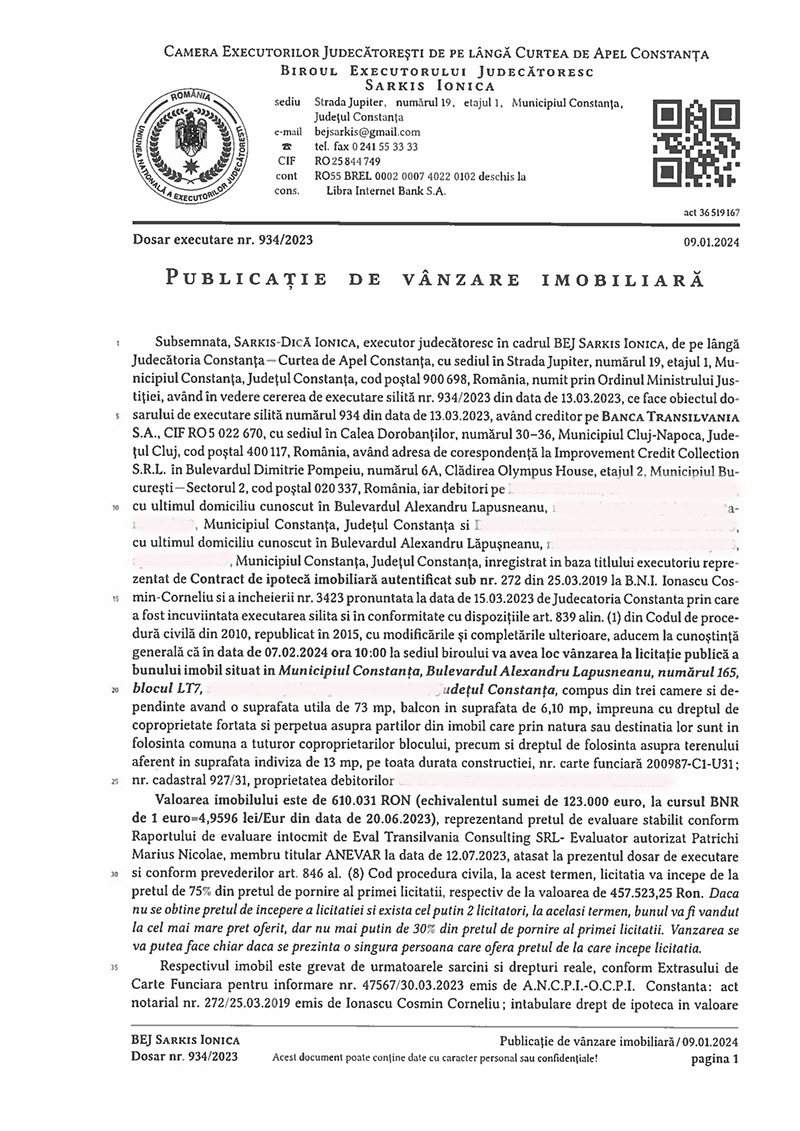 Dosarul de executare silită are drept creditor Banca Transilvania, iar ca debitori, doi soți din Constanța.