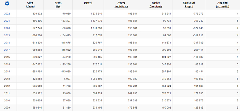Firma a avut, în 2022, o cifră de afaceri de 339.832 lei, pierderi de 70.000 de lei, a înregistrat datorii de 1,33 de milioane de lei și a avut 4 angajați.