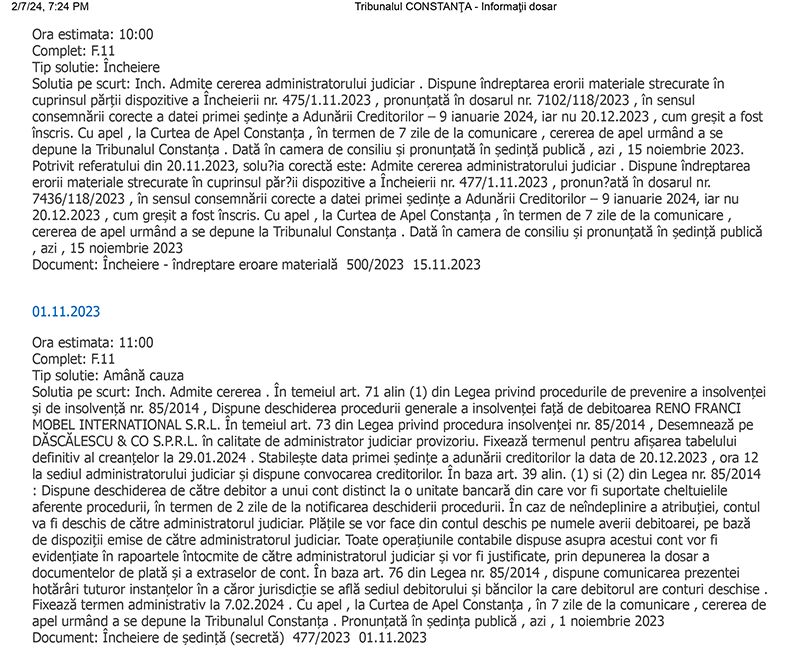 Amânare, pentru 12 martie 2024 în dosarul de insolvență a debitoarei SC Reno Franci Mobel International SRL, după ce completul de judecată la care a fost repartizat dosarul, s-a desființat printr-o decizie a Președintelui Tribunalului Constanța.