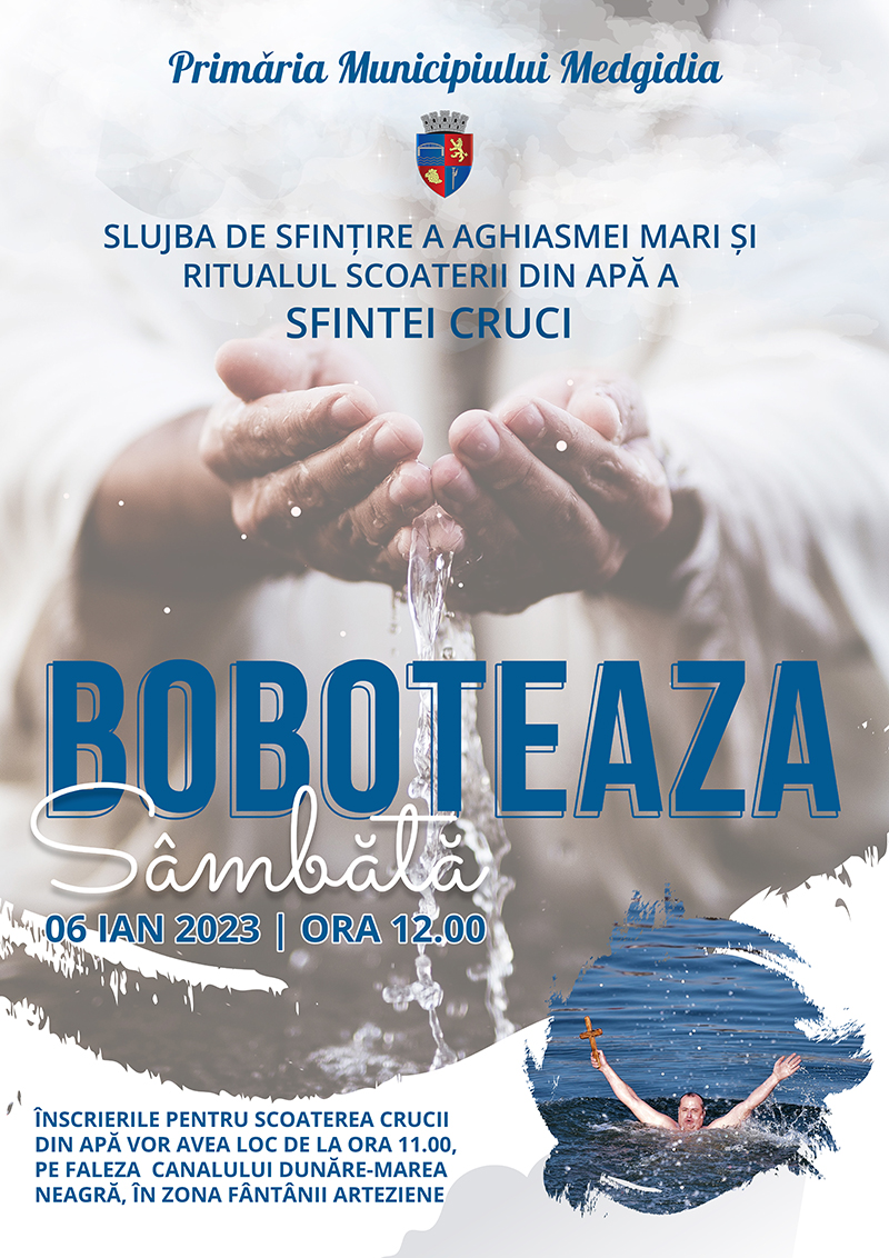 Primăria Municipiului Medgidia, alături de Protoieria Medgidia, organizează sâmbătă, 6 ianuarie 2024, de la ora 12.00, activități religioase cu ocazia Sfintei Sărbători de Bobotează, pe faleza Canalului Dunăre-Marea Neagră (în zona fântânii arteziene).