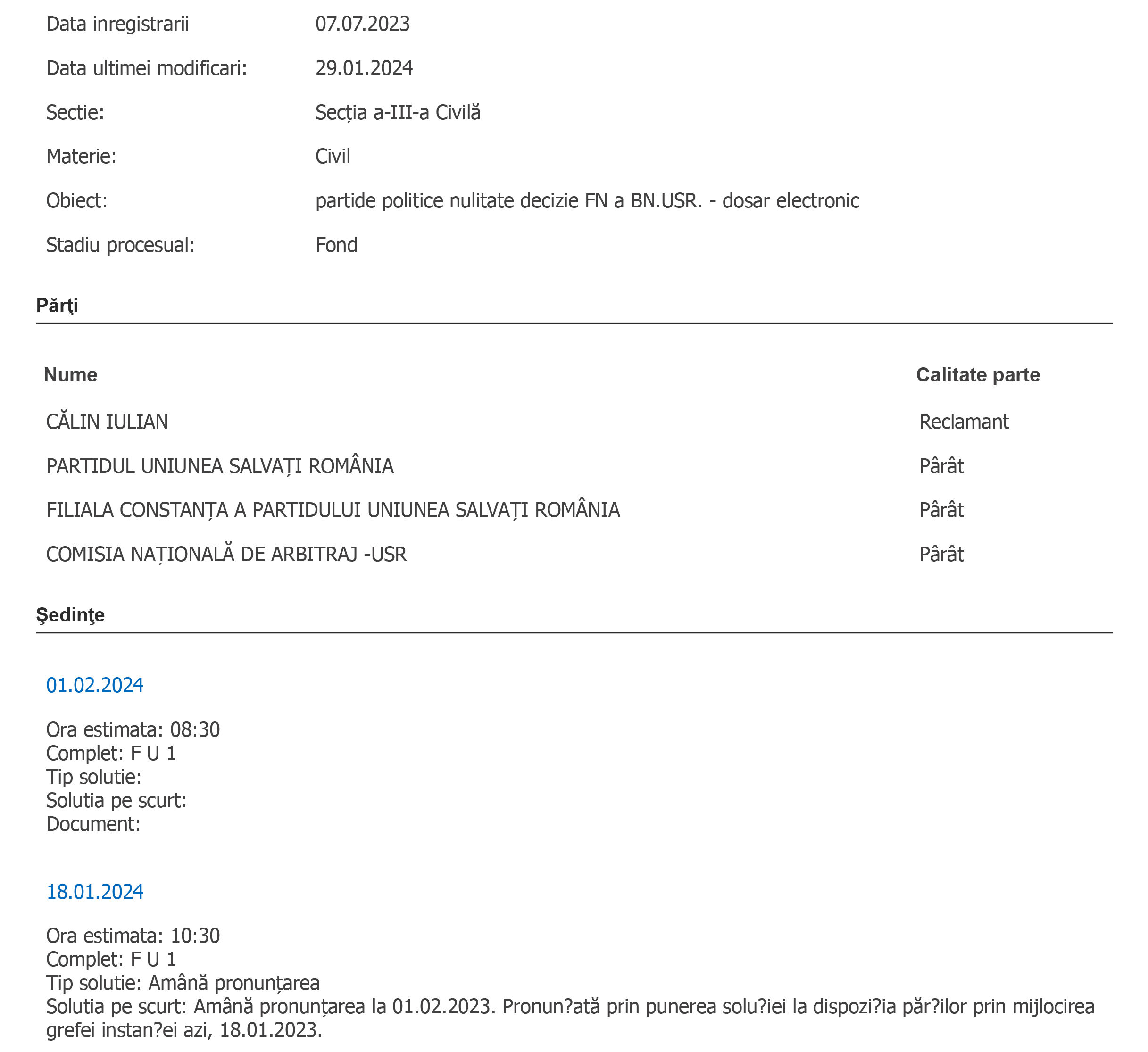 Potrivit minutei judecătorești, pronunțarea a fost amânată pentru 15 februarie 2024.