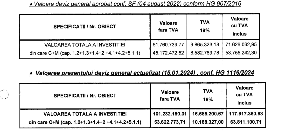 „Valoarea totală a investiției este de 101.232.150,31 lei fără TVA, respectiv 117.917.350,98 lei cu TVA, din care valoarea construcții-montaj (C+M) este de 53.622.773,71 lei fără TVA, respectiv 63.881.100,71 lei cu TVA.”