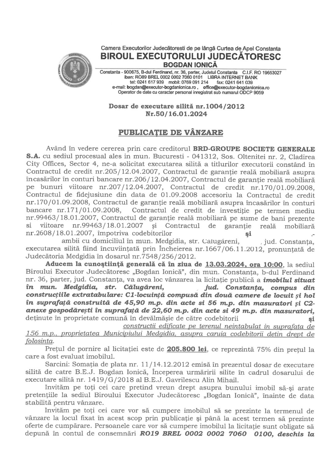O casă de pe strada Călugăreni din Medgidia este scoasă la licitație publică, într-un dosar de executare silită, de către Biroul Judecătoresc Bogdan Ionică. Imobilul este în proprietatea a doi codebitori ai unui credit încheiat la BRD.