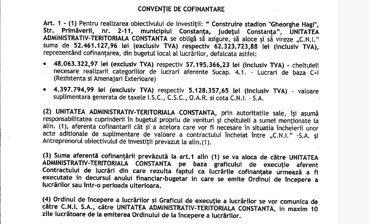 În cadrul ședinței ordinare de miercuri, 31.01.2024, consilierii locali ai municipiului Constanța vor dezbate și supune votului aprobarea Convenţiei de cofinanţare încheiate între Unitatea Administrativ Teritorială Municipiului Constanţa şi Compania Naţională de Investiţii S.A. pentru construire stadionului ″Gheorghe Hagi″. Prin această convenție UAT-ul se obligă să asigure suma de 52.461.127,96 de lei fără TVA, respectiv 62.323.723,88 de lei, inclusiv TVA pentru realizarea proiectului.