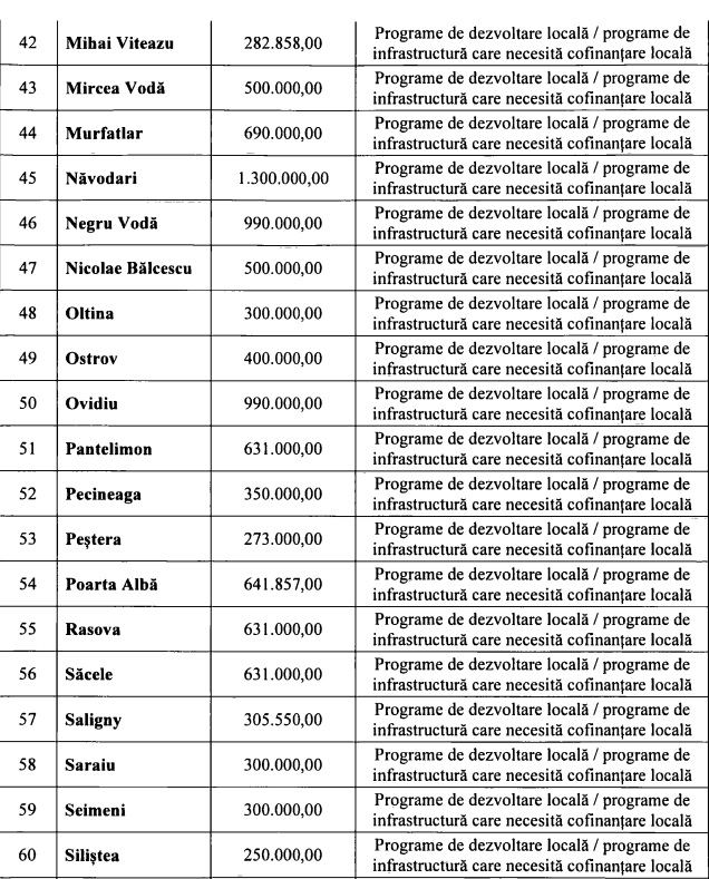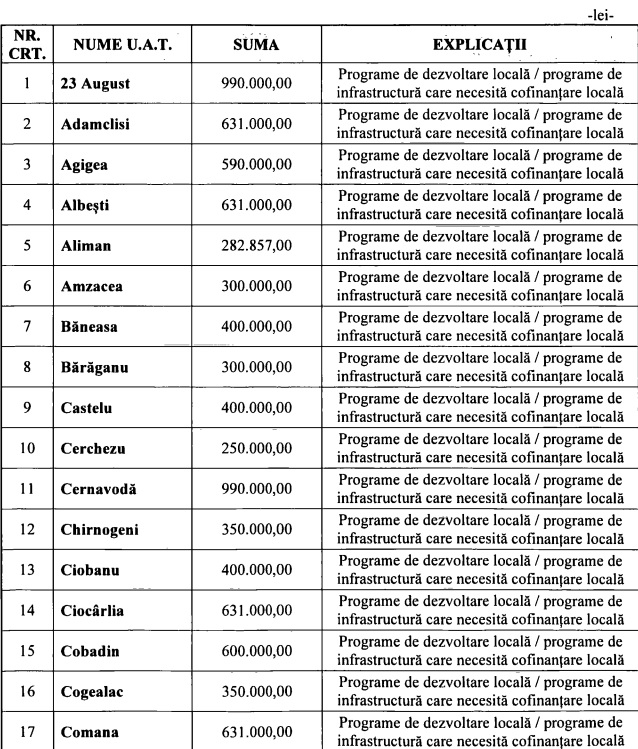Câte 990.000 lei vor primi Primăriile Cernavodă, Eforie, Hârșova, Mihail Kogălniceanu, Ovidiu, Techirghiol, Valu lui Traian și Negru Vodă, în timp ce Primăria 23 August va primi 900.000 de lei, iar Primăria Cumpăna – 800.000 de lei.